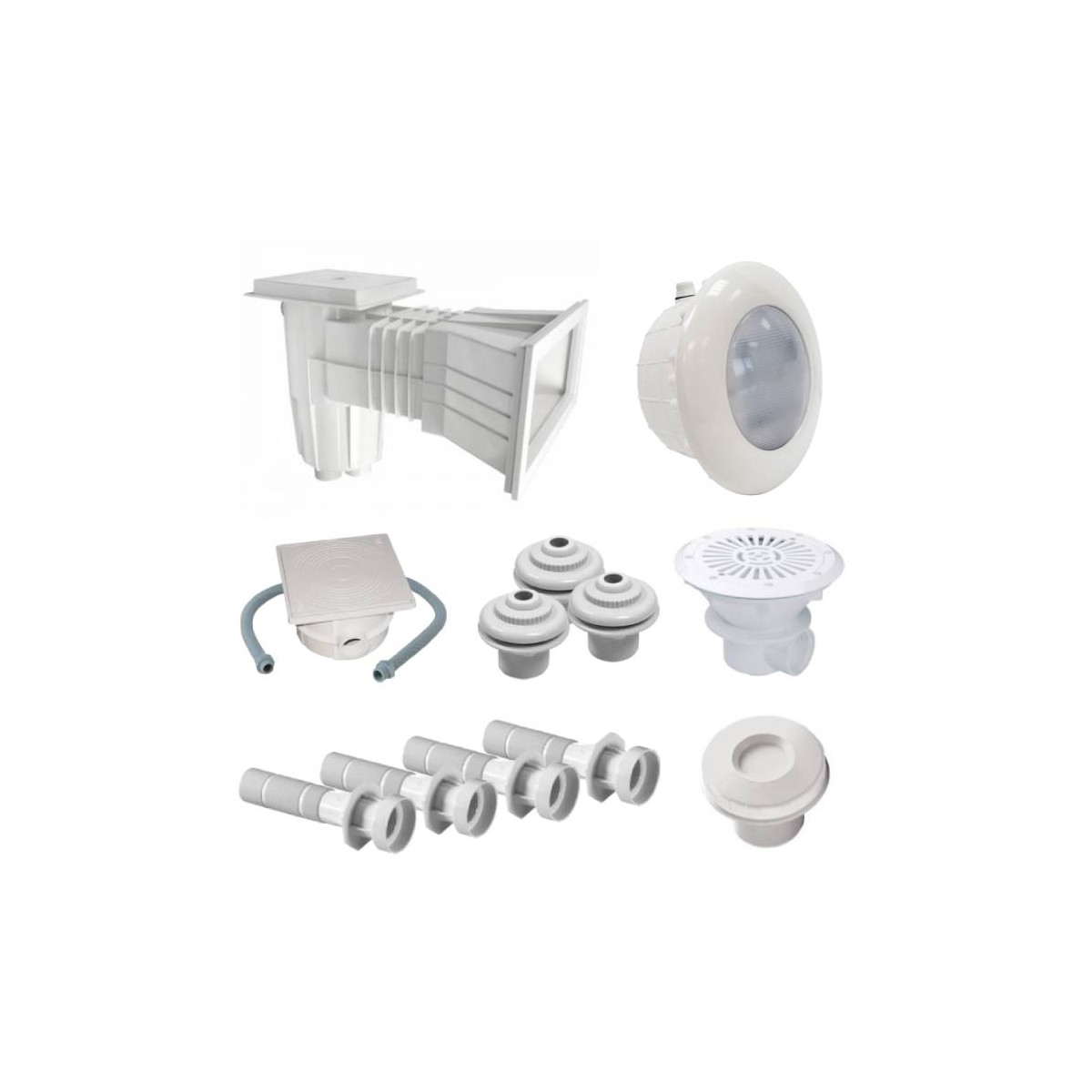 Le calcul du nombre de pièces à sceller en aspiration et en refoulement est essentiel pour garantir une parfaite hydraulicité et un bon brassage de l'eau. En ce sens, ce kit est prévu pour une filtration d'un débit de 12 m3/h. Soit en aspiration : un skimmer et une bonde de fond (12 à 13 m3/h de capacité d'aspiration), et 3 buses en refoulement (environ 15 m3/h de capacité de refoulement). Les traversées de paroi permettent le branchement des buses et de la prise balai. Enfin, un projecteur LED basse-consommation assure l'illumination du bassin (livré avec sa niche à sceller, presse-étoupe, ampoule, visserie, passe-câble et boîte de connexion).