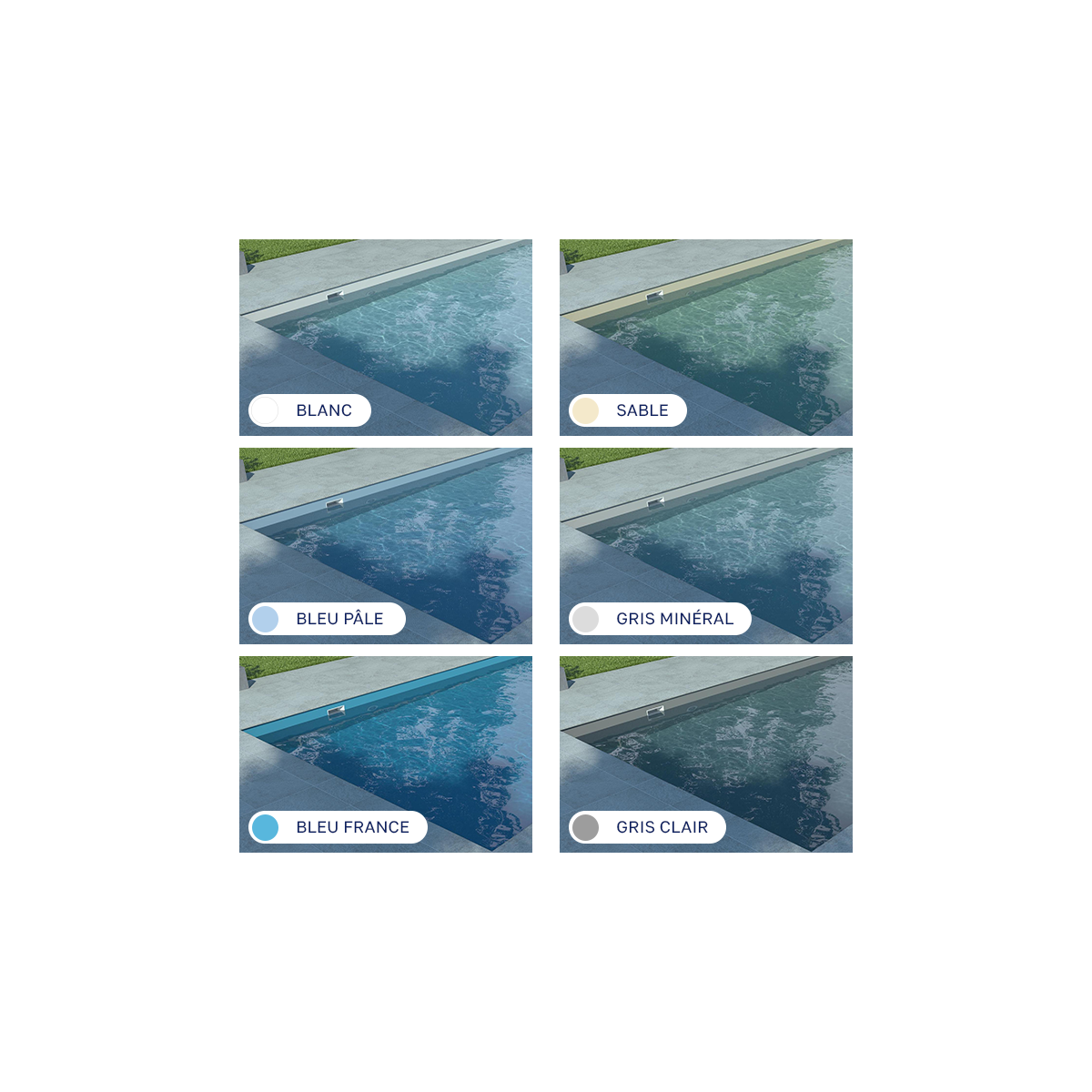 Le choix de la couleur de votre revêtement transforme l'aspect de votre espace de baignade. Nos 6 coloris unis permettent de créer des rendus en eau variés et de répondre à tous les goûts : du bleu cristallin avec un liner blanc à un rendu turquoise "paradisiaque avec un liner sable.